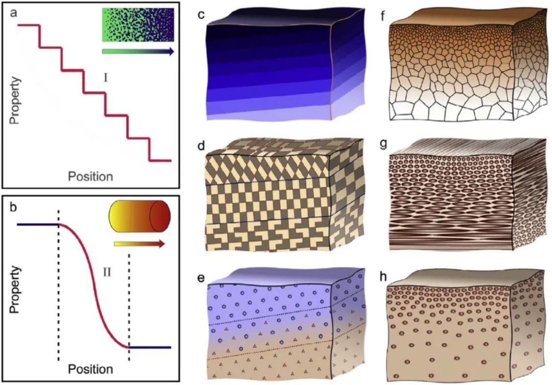 图2 (a)不连续梯度材料和(b)连续梯度材料示意图(c)、(d)和(e)分别为两种类型的二次相颗粒的化学成分、晶粒取向和体积分数逐渐变化的界面组成的不连续梯度材料示意图。(f)、(g)和(h)显示了连续梯度材料在无界面情况下,晶粒尺寸、纤维取向和二次相颗粒体积分数发生轻微变化的示意图。