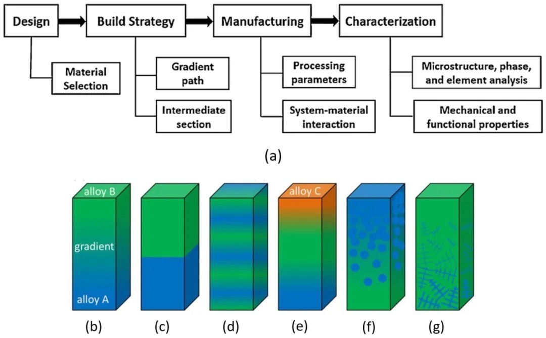 图5a为LMD工艺制造梯度金属材料的步骤(可推广到AM的所有熔化凝固工艺)。通常,梯度系统设计材料的选择是基于物理、冶金和机械性能存在问题的应用,如热膨胀系数的巨大差异或零件不同成分之间形成不良化合物(类似于在不同焊接中所看到的)。虽然图5a对于构建策略一般有梯度路径或中间段两种选择,但在图5b-g中有更详细的描述。图5b显示了从纯合金a到纯合金B的线性梯度,其中化学成分分布的步长和精度将与使用的LMD系统的局限性成正比。图5c显示了化学成分中具有过渡步骤的结构,当过渡层没有脆性化合物时,这个梯度将是有用的。图5d显示了在一个剖面中可以使用磁差或两相邻层之间的热膨胀来制作多个梯度。图5e显示了三种不同材料成分的过渡,从蓝色(纯合金A)到绿色(纯合金B),然后从绿色到橙色(纯合金C)。当两种合金不能分级而不形成脆性相时,这种重要的构建策略是有用的。但是可以在第三种中级材料的帮助下进行评分。