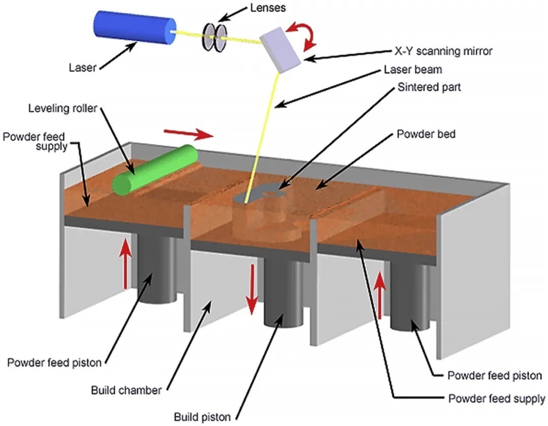 图3 选择性激光烧结或熔化(SLS/SLM)系统的原理图。
