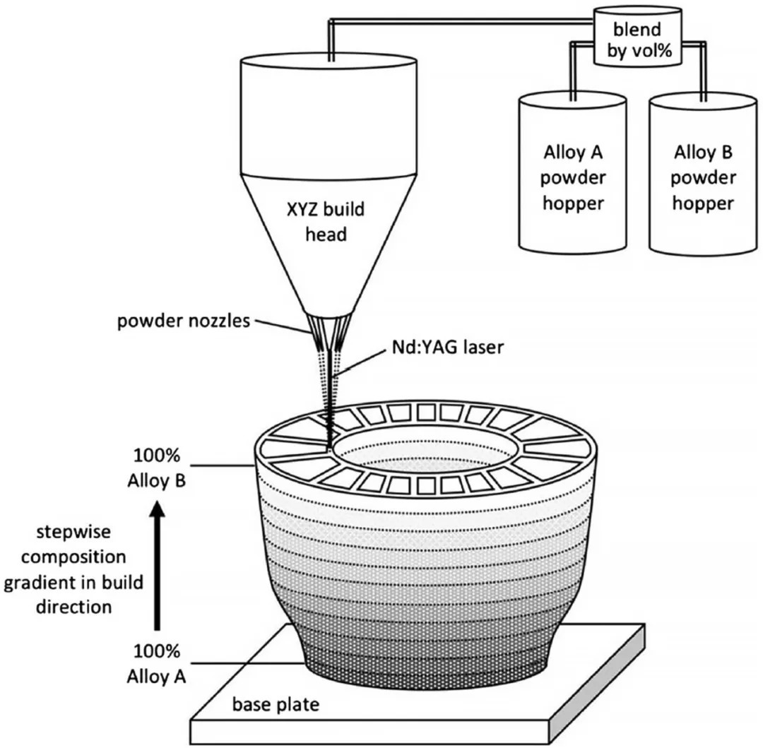 图4激光金属沉积(LMD)过程的示意图,有几个独立的粉末馈线,能够产生复杂的几何形状,化学成分沿建造方向逐渐变化。
