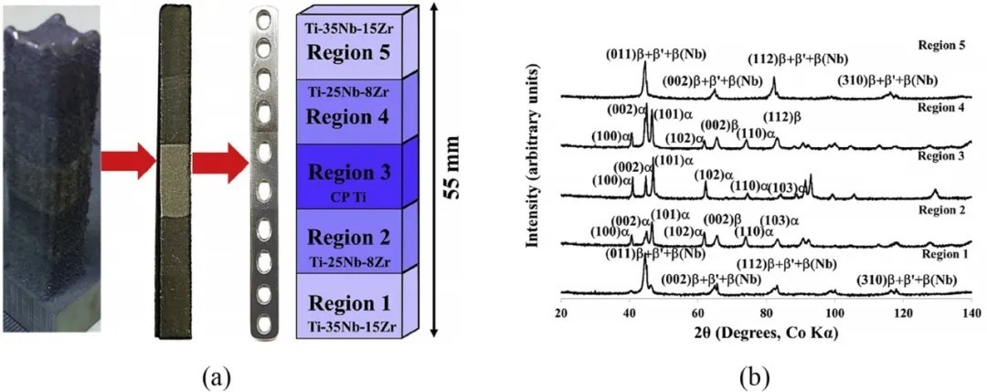 图6 a)从LENS处理到最后部分制作固定梯度板的步骤,以及梯度结构设计。b)与梯度结构区域相关的XRD谱图。