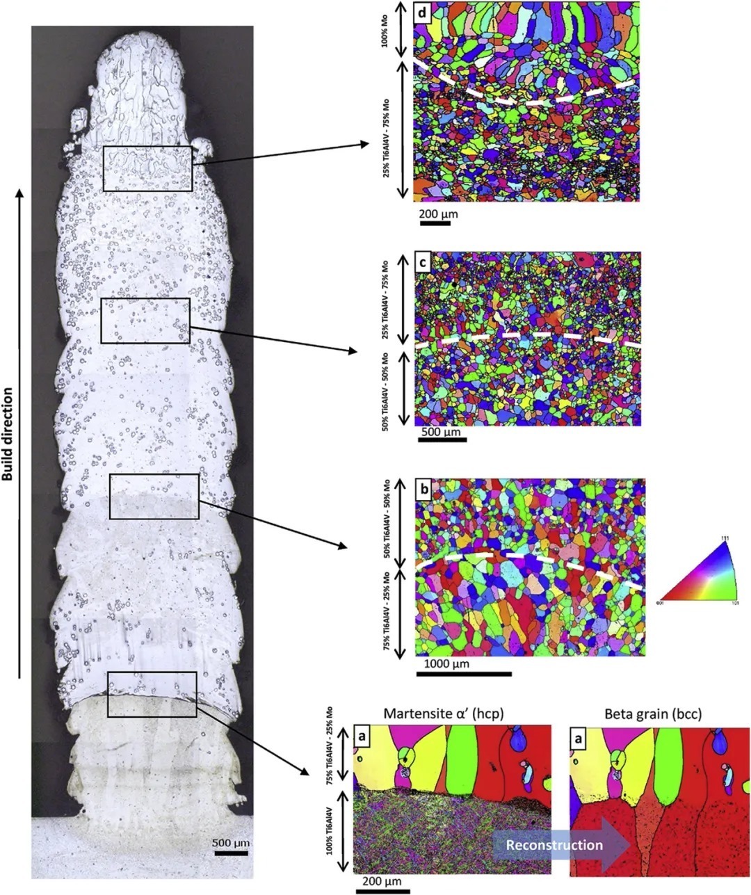 点的梯度结构从CP-Ti Ti-35Nb-15Zr(图6),根据衍射模式各自的区域在图6 b,以及α的成功实现一个合适的分布和软β阶段在整个结构(由应用程序的比例组合β稳定元素),Lima 等观察到,在结构的1和5区域,由于可能存在相分离和未熔化/部分熔化的铌颗粒,可以检测到两个相β '和Nb。他们将铌粒子不完全熔化的原因归结为其他成分(如高熔点和低激光吸收)的不同物理性质及其与钛的吸热反应。基于另一项研究,图7显示了沿Ti6Al4V/Mo梯度结构的晶粒形态演变,其中注意到未熔化的钼颗粒(由于各区域输入能量密度不足)。不管是否存在未熔化的颗粒,从图7a-d中的EBSD图中可以清楚地看出梯度区界面处的β晶粒连续性和良好的冶金结合。根据IPF图,尽管在100% Ti6Al4V区域结构非常强,但在<随着Mo在梯度区加入,β晶粒变小,呈等轴状(没有特定的晶体取向)。随着Mo浓度的增加,凝固界面前部过冷度的增加是晶粒沿梯度结构发生形貌改变的原因。