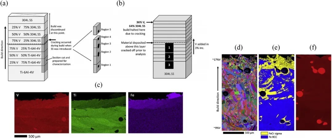 在钛合金与其他工程合金的AM中,一个主要的问题是脆性金属间化合物的形成,这很容易导致这些结构的过早失效,甚至在加工过程中。因此,人们做出了许多努力来研究、减少或消除这一问题。为了研究Ti6Al4V-V-SS304L梯度沉积,Reichardt 层根据图8a和B分别设计了两个样品A和B。而A试样和B试样分别在75% V + 25% SS304L和36% V + 64% SS304L区域因开裂而停止制作。EDS地图显示样品表面导致的裂纹边缘(图8c),同时存在铁和钛元素会导致脆性金属间化合物的形成化合物在这个地区由于相邻层的混合非常低,导致高潜在开裂。裂纹表面FeTi金属间化合物的x射线衍射分析证实了这一说法。另一方面,EBSD映射阶段分布(图8 e)和钒的EDS地图(图8 f)从表面裂纹附近的区域1的示例B,分别显示西格玛(σ)的形成脆性阶段和不熔化的钒粉末层接近裂纹夹杂物。