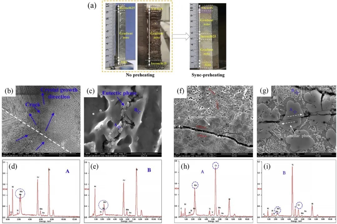 图9 a)无同步预热和有同步预热的梯度试样。b–e)裂纹的形态SS316L / IN625(没有预热)及其周围的组织,在EDS分析的结果(c)中所示的点外:我)裂纹的形态IN625 /Ti6Al4V(没有预热)及其周围的组织,在EDS分析的结果(g)所示的点。